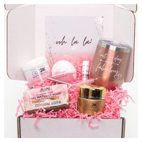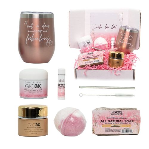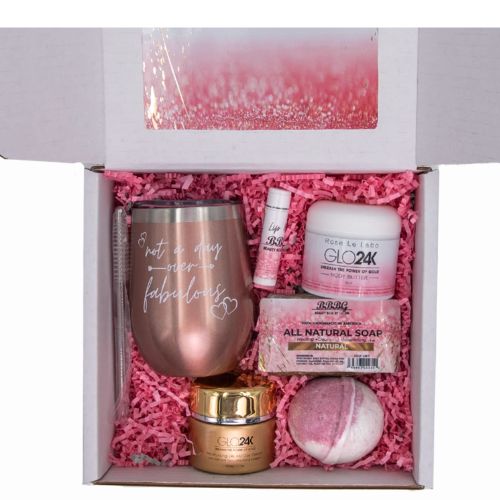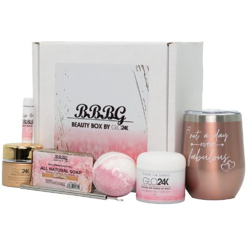 Our Beauty Gift Box includes GLO24K Luxurious Best-Selling Moisturising Day Cream, GLO24K Body Butter, 12Oz Exclusive Insulated Stainless Steel Tumbler, Hand Made 5Oz Natural Soap, 5Oz Bath Bomb, Lip Balm, and a Greeting Card. The GLO24K Beauty Gift Box is a pampering and memorable gift idea for anyone to feel relaxed, loved, and appreciated.