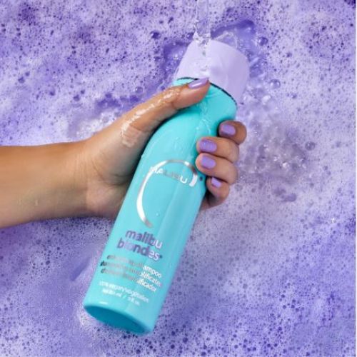 Malibu C Blondes Nourishes, Enhancing Shampoo removes brassy, muddy, and green tones and hues from blonde.