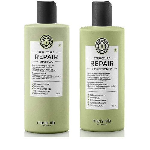 Maria Nila structure repair shampoo and conditioner set (350/300mls) for damaged, dry and chemically treated hair that moisturises and strengthens hair structure. This lovely shampoo contains repairing Algae extract to help hair regain its natural strength, softness and shine. Maria Nila repair shampoo free from sulphates and parabens, this also boasts Colour Guard Complex, which protects hair and reduces the loss of colour associated with washing, heat styling, UV rays and free radicals