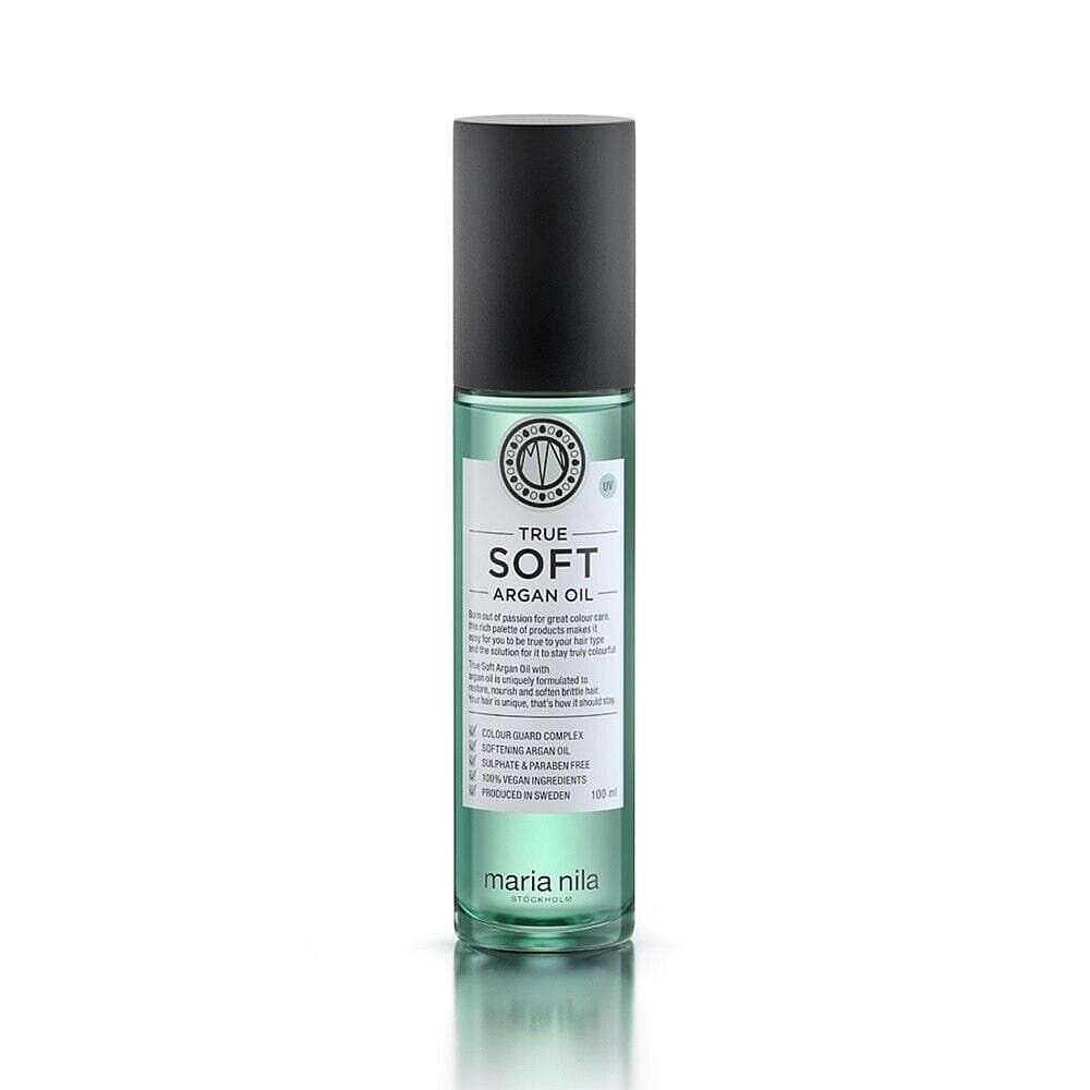Maria Nila True Soft Argan Oil softens, moisturises and strengthens hair. Quickly absorbed for hair that is smooth to the touch and frizz-free. With 100 percent vegan ingredients, completely sulphate and paraben-free. Pack size 100ml.
