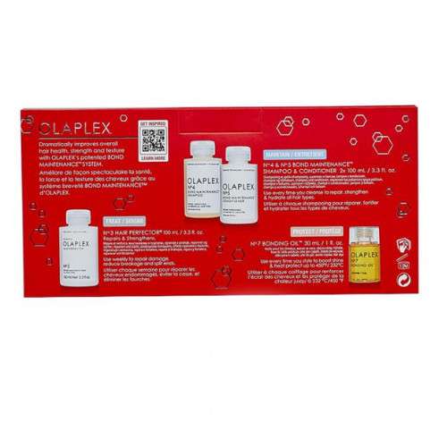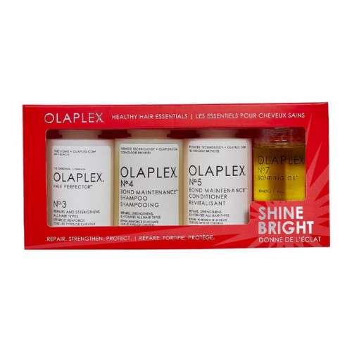 Olaplex Healthy Hair Essentials 2021 Retail Holiday Kit is to help repair, strengthen, hydrate, and protect hair on holiday for the best holiday hair ever containing a full size of Olaplex No.3 Hair Perfector, travel friendly sizes of No.4 Bond Maintenance Shampoo and No.5 Bond Maintenance Conditioner and a full size of No.7 Bonding Oil for heat protection up to 450F/230C.
